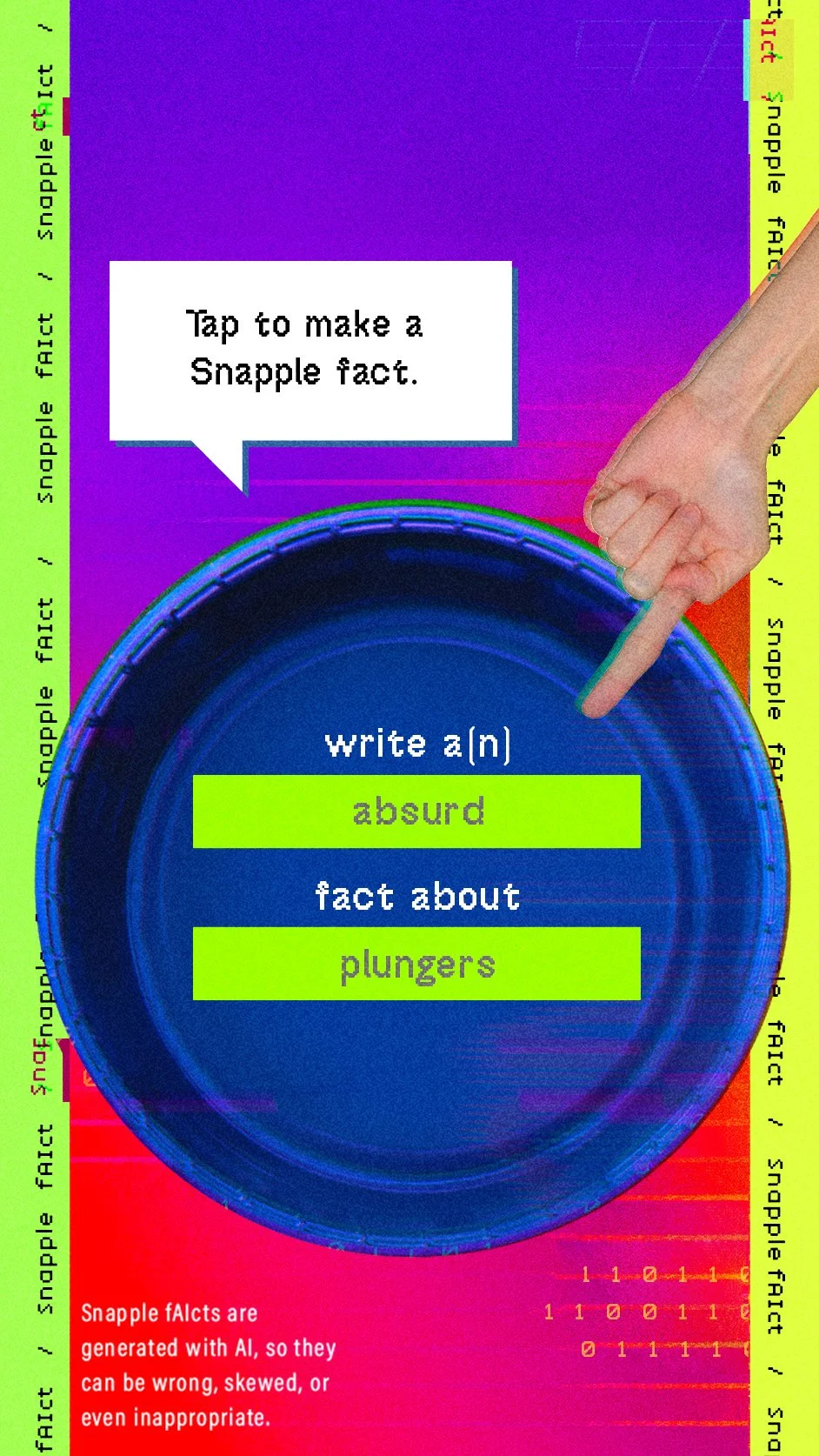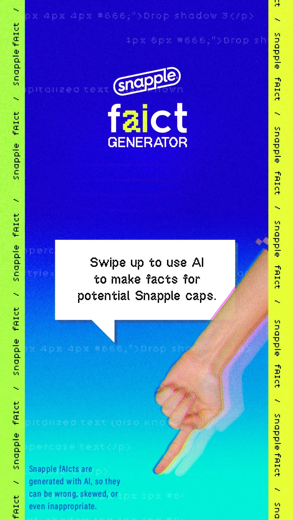 A month into the launch of Chat GPT, we worked quickly to put it in the hands of our fans to create custom Snapple facts about virtually anything. The best fan-made facts will be printed on Snapple caps.